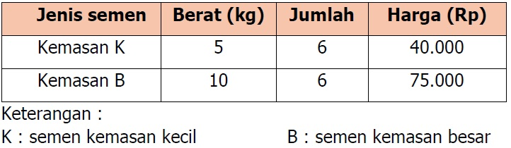 Seorang kontraktor bangunan akan melapisi lantai sebuah ruang kelas seluas 120 m2. Karena proyek harus segera dikerjakan, kontraktor membeli semen di toko bangunan terdekat. Namun, sebagian besar stok semen di toko tersebut sedang habis dan pengiriman ulang belum datang, sehingga hanya tersedia beberapa persediaan berikut.