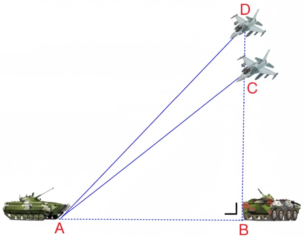Diketahui jarak dua tank (AB) adalah 240 m, jarak pandang pesawat C dengan tank A adalah 260 m, dan pesawat D dengan tank A adalah 300 m Berdasarkan informasi di atas, Tentukan Benar atau Salah untuk setiap pernyataan berikut!