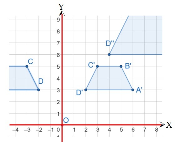 Trapesium A′B′C′D′ adalah bayangan dari trapesium ABCD setelah dicerminkan terhadap sumbu Y, kemudian tapesium A′B′C′D′ didilatasi dengan pusat O(0,0) dengan faktor skala k memiliki bayangan akhir trapesium A′′B′′C′′D′′.